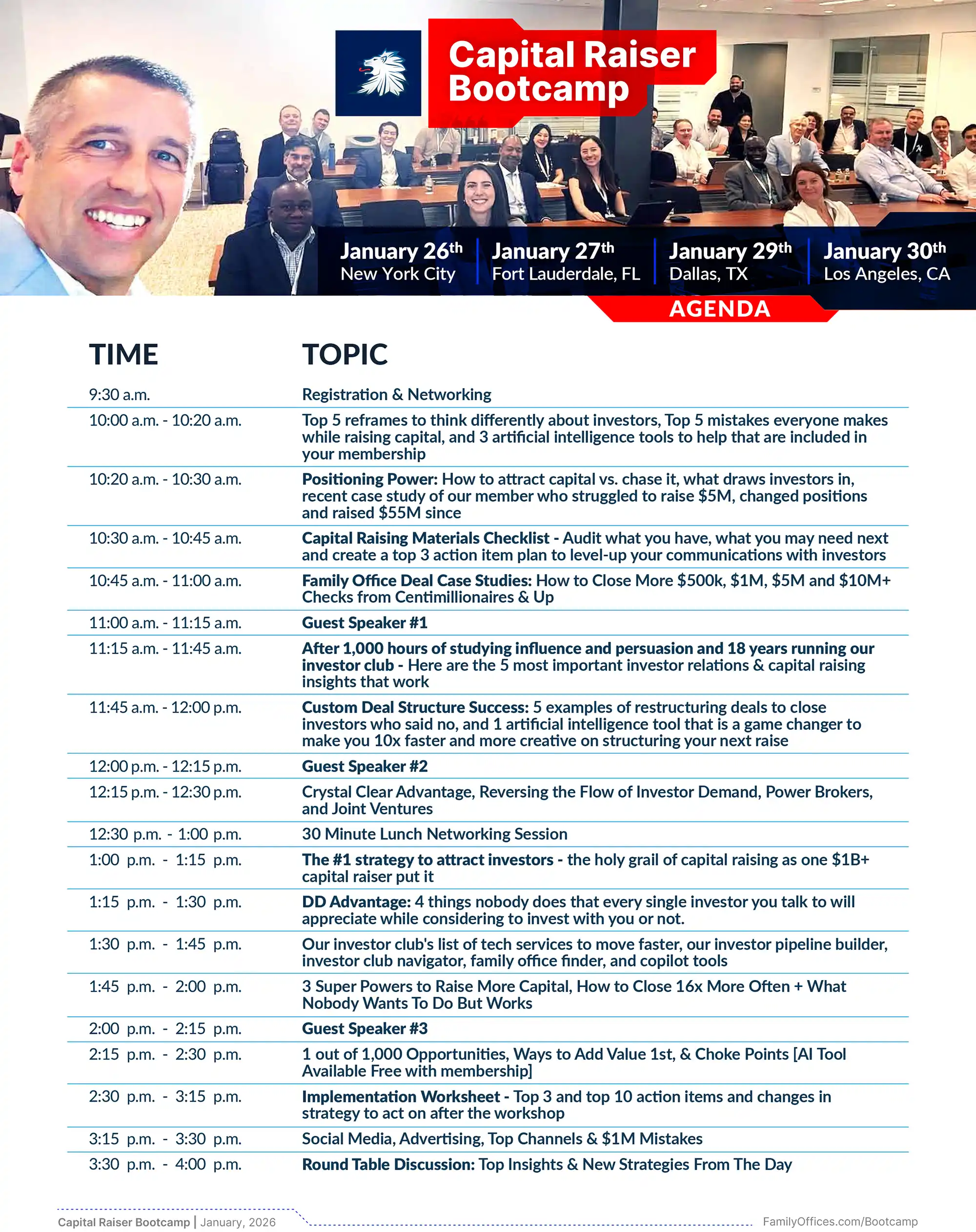 In-Person Capital Raising Workshops in NYC, LAX, DFW + FLL: January 26th-30th