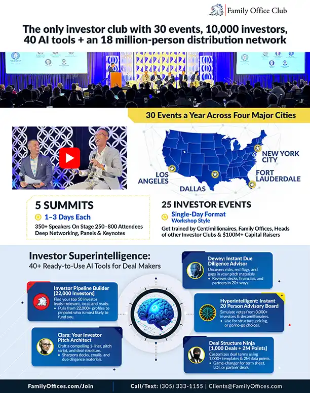 SINGLE DATABASE CHECKOUT Returning customer? Click here to login If you have shopped with us before, please enter your details below. If you are a new customer, please proceed to the Billing section. Username or email * Password * Remember me Lost your password? Login FamilyOffices.com Account Login Information Create your login credentials Email * FamilyOffices.com Profile Fields marked with * are mandatory First name * Last name * Phone * Company (optional) Street address * Apartment, suite, unit etc (optional) Town / City * Postcode * Country *Select a country / region…United States (US)CanadaUnited Kingdom (UK)SingaporeAustraliaGermanyUnited Arab EmiratesRussiaAfghanistanÅland IslandsAlbaniaAlgeriaAmerican SamoaAndorraAngolaAnguillaAntarcticaAntigua and BarbudaArgentinaArmeniaArubaAustriaAzerbaijanBahamasBahrainBangladeshBarbadosBelarusBelauBelgiumBelizeBeninBermudaBhutanBoliviaBonaire, Saint Eustatius and SabaBosnia and HerzegovinaBotswanaBouvet IslandBrazilBritish Indian Ocean TerritoryBruneiBulgariaBurkina FasoBurundiCambodiaCameroonCape VerdeCayman IslandsCentral African RepublicChadChileChinaChristmas IslandCocos (Keeling) IslandsColombiaComorosCongo (Brazzaville)Congo (Kinshasa)Cook IslandsCosta RicaCroatiaCubaCuraçaoCyprusCzech RepublicDenmarkDjiboutiDominicaDominican RepublicEcuadorEgyptEl SalvadorEquatorial GuineaEritreaEstoniaEswatiniEthiopiaFalkland IslandsFaroe IslandsFijiFinlandFranceFrench GuianaFrench PolynesiaFrench Southern TerritoriesGabonGambiaGeorgiaGhanaGibraltarGreeceGreenlandGrenadaGuadeloupeGuamGuatemalaGuernseyGuineaGuinea-BissauGuyanaHaitiHeard Island and McDonald IslandsHondurasHong KongHungaryIcelandIndiaIndonesiaIranIraqIrelandIsle of ManIsraelItalyIvory CoastJamaicaJapanJerseyJordanKazakhstanKenyaKiribatiKosovoKuwaitKyrgyzstanLaosLatviaLebanonLesothoLiberiaLibyaLiechtensteinLithuaniaLuxembourgMacaoMadagascarMalawiMalaysiaMaldivesMaliMaltaMarshall IslandsMartiniqueMauritaniaMauritiusMayotteMexicoMicronesiaMoldovaMonacoMongoliaMontenegroMontserratMoroccoMozambiqueMyanmarNamibiaNauruNepalNetherlandsNew CaledoniaNew ZealandNicaraguaNigerNigeriaNiueNorfolk IslandNorth KoreaNorth MacedoniaNorthern Mariana IslandsNorwayOmanPakistanPalestinian TerritoryPanamaPapua New GuineaParaguayPeruPhilippinesPitcairnPolandPortugalPuerto RicoQatarReunionRomaniaRwandaSão Tomé and PríncipeSaint BarthélemySaint HelenaSaint Kitts and NevisSaint LuciaSaint Martin (Dutch part)Saint Martin (French part)Saint Pierre and MiquelonSaint Vincent and the GrenadinesSamoaSan MarinoSaudi ArabiaSenegalSerbiaSeychellesSierra LeoneSlovakiaSloveniaSolomon IslandsSomaliaSouth AfricaSouth Georgia/Sandwich IslandsSouth KoreaSouth SudanSpainSri LankaSudanSurinameSvalbard and Jan MayenSwedenSwitzerlandSyriaTaiwanTajikistanTanzaniaThailandTimor-LesteTogoTokelauTongaTrinidad and TobagoTunisiaTürkiyeTurkmenistanTurks and Caicos IslandsTuvaluUgandaUkraineUnited States (US) Minor Outlying IslandsUruguayUzbekistanVanuatuVaticanVenezuelaVietnamVirgin Islands (British)Virgin Islands (US)Wallis and FutunaWestern SaharaYemenZambiaZimbabweUpdate country / region State (optional) Select an option…AlabamaAlaskaArizonaArkansasCaliforniaColoradoConnecticutDelawareDistrict of ColumbiaFloridaGeorgiaHawaiiIdahoIllinoisIndianaIowaKansasKentuckyLouisianaMaineMarylandMassachusettsMichiganMinnesotaMississippiMissouriMontanaNebraskaNevadaNew HampshireNew JerseyNew MexicoNew YorkNorth CarolinaNorth DakotaOhioOklahomaOregonPennsylvaniaRhode IslandSouth CarolinaSouth DakotaTennesseeTexasUtahVermontVirginiaWashingtonWest VirginiaWisconsinWyomingArmed Forces (AA)Armed Forces (AE)Armed Forces (AP) Did someone help you today? If so please specify Did someone help you today? (optional) Nobody, the Website Was HelpfulAndres OspinaDaphny ObregonJennifer VelasquezJimmy EgasJohn MilanovichXander ClemensRichard C. Wilson Join our private investor club today to start connecting with investors now: (Charter members can immediately access the member portal after payment is complete) Select Your Purchase Price 1 Single Database Databases: Angel Investors, Choose an option $79.00 / month with 1 month free trial and a $495.00 sign-up fee - + $495.00 WHAT'S INCLUDED IN YOUR PURCHASE Single Database Membership Addons (Optional) Order Summary - Below are the items your are purchasing today Product Total 1 Single Database × 1 $79.00 / month with 1 month free trial and a $495.00 sign-up fee Subtotal $495.00 Total $495.00 Recurring totals Subtotal $79.00 / month Tax $0.00 / month Recurring totals $79.00 / monthFirst renewal: 03/02/2026 Have a coupon? Click here to enter your code Coupon code Apply Total Due Today $495.00 Payment method Credit / Debit Card Use a new payment method Save payment information to my account for future purchases. Since your browser does not support JavaScript, or it is disabled, please ensure you click the <em>Update Totals</em> button before placing your order. You may be charged more than the amount stated above if you fail to do so. Update totals Your personal data will be used to process your order, support your experience throughout this website, and for other purposes described in our privacy policy. REGISTER NOW * 100% Secure & Safe Payments *